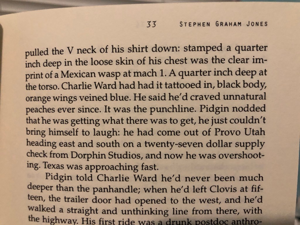 The book whips. It comes right out the gate full force, chunky paragraphs that feel like waterfalls of action, description, and personality. Sometimes, when he’s describing something, Jones sounds like he’s going with the first thought that comes into his head, and it leads to a moment of pause while you figure it out, but it doesn’t take much time. Pretty soon you’re in his register, and the thing moves along at a brisk pace. It’s a book that teaches you how to read it as you go along. There’s a 30-page learning curve. It’s easy. And worth it.